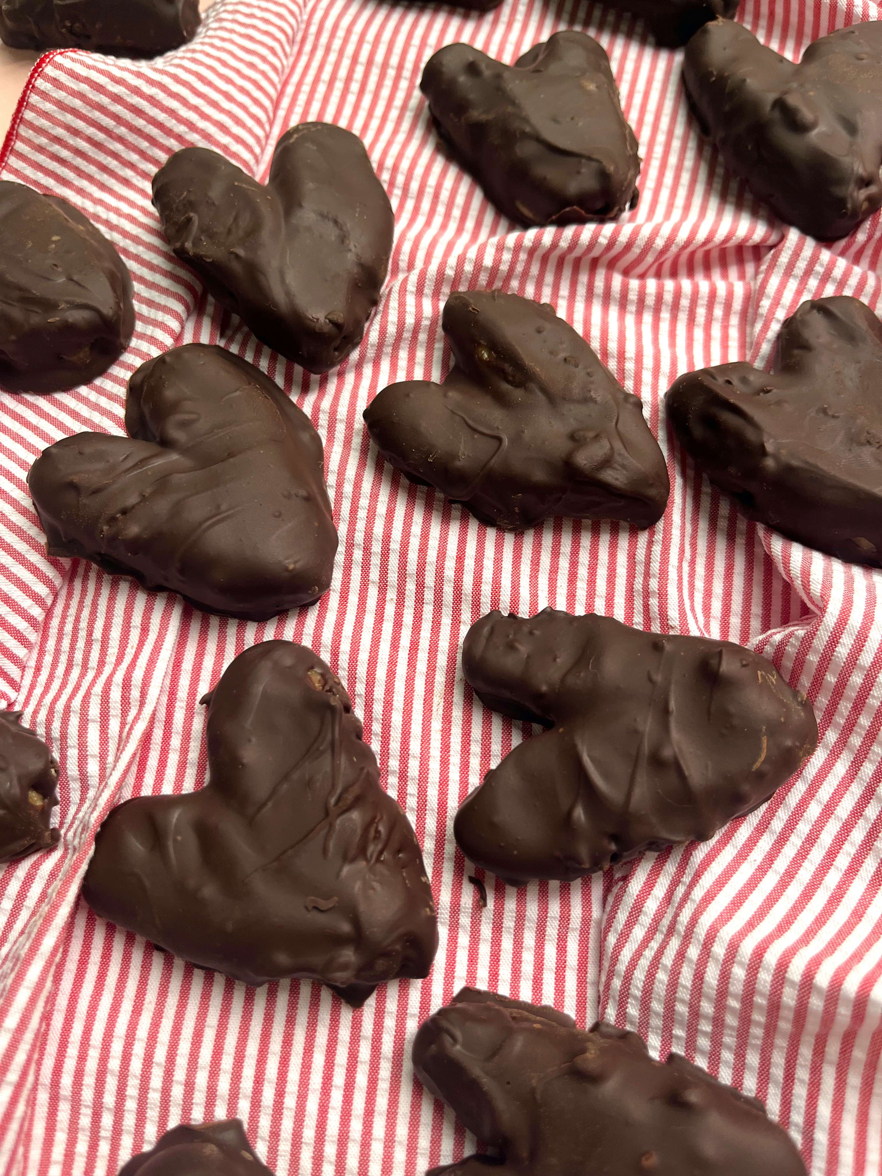 5. Dip hearts in the chocolate to cover completely - I used a fork to make this process a bit less messy. Place back on the parchment-lined baking sheet when finished.